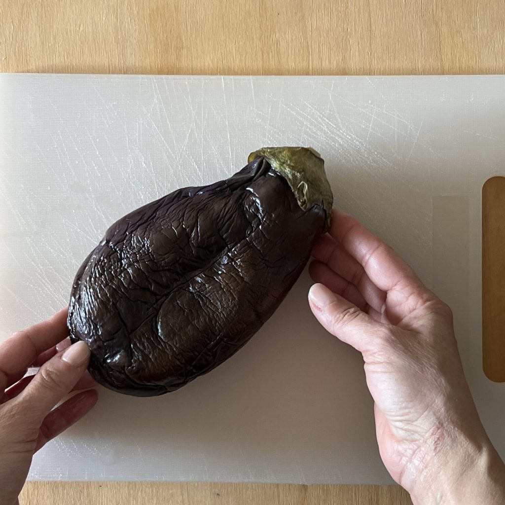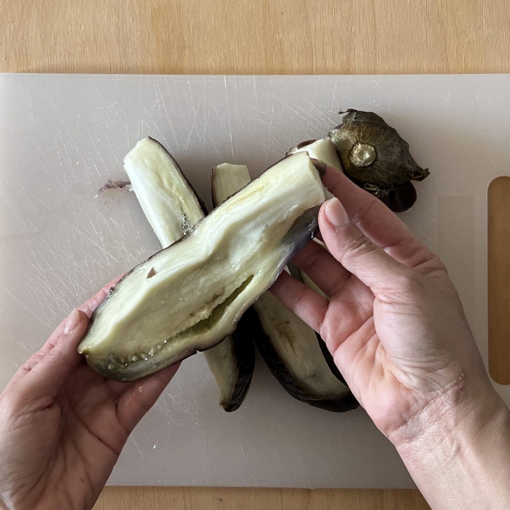 Laat de aubergine, eenmaal gekookt, afkoelen, verwijder vervolgens de steel en snijd hem in de lengte in stukken.