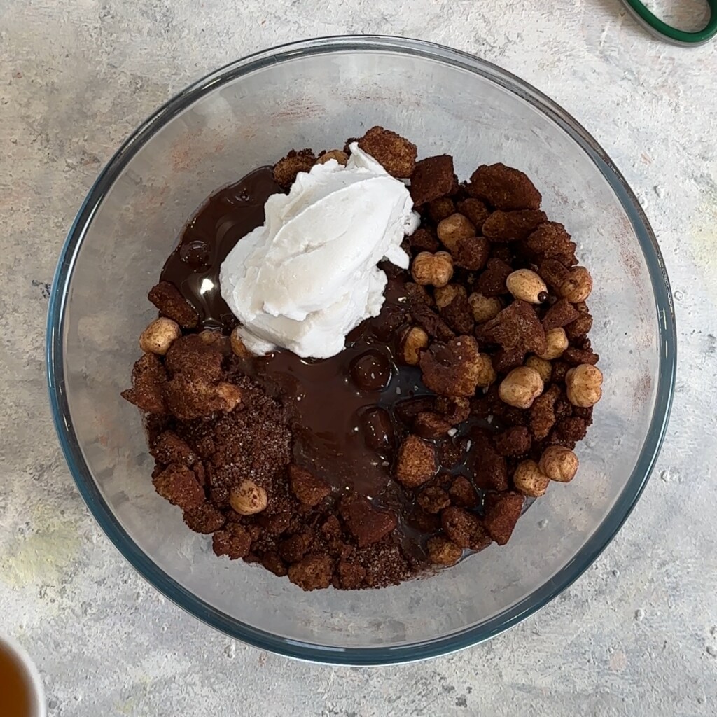 Giet de koekjes in de kom en voeg de cacaopoeder toe, de erythritol, de hazelnoten en meng het.