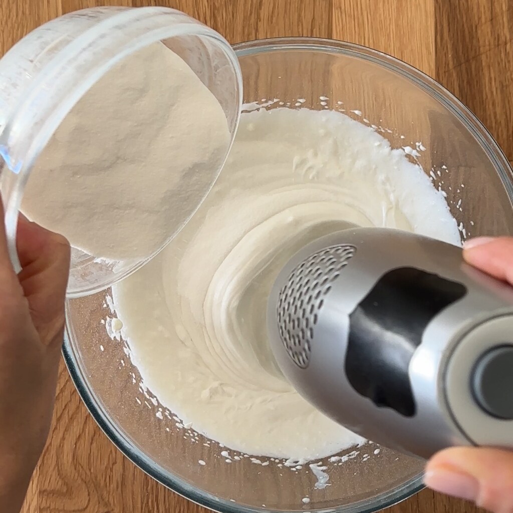 Voeg de inuline toe en klop met de kloppers, tot het volledig is opgenomen.
