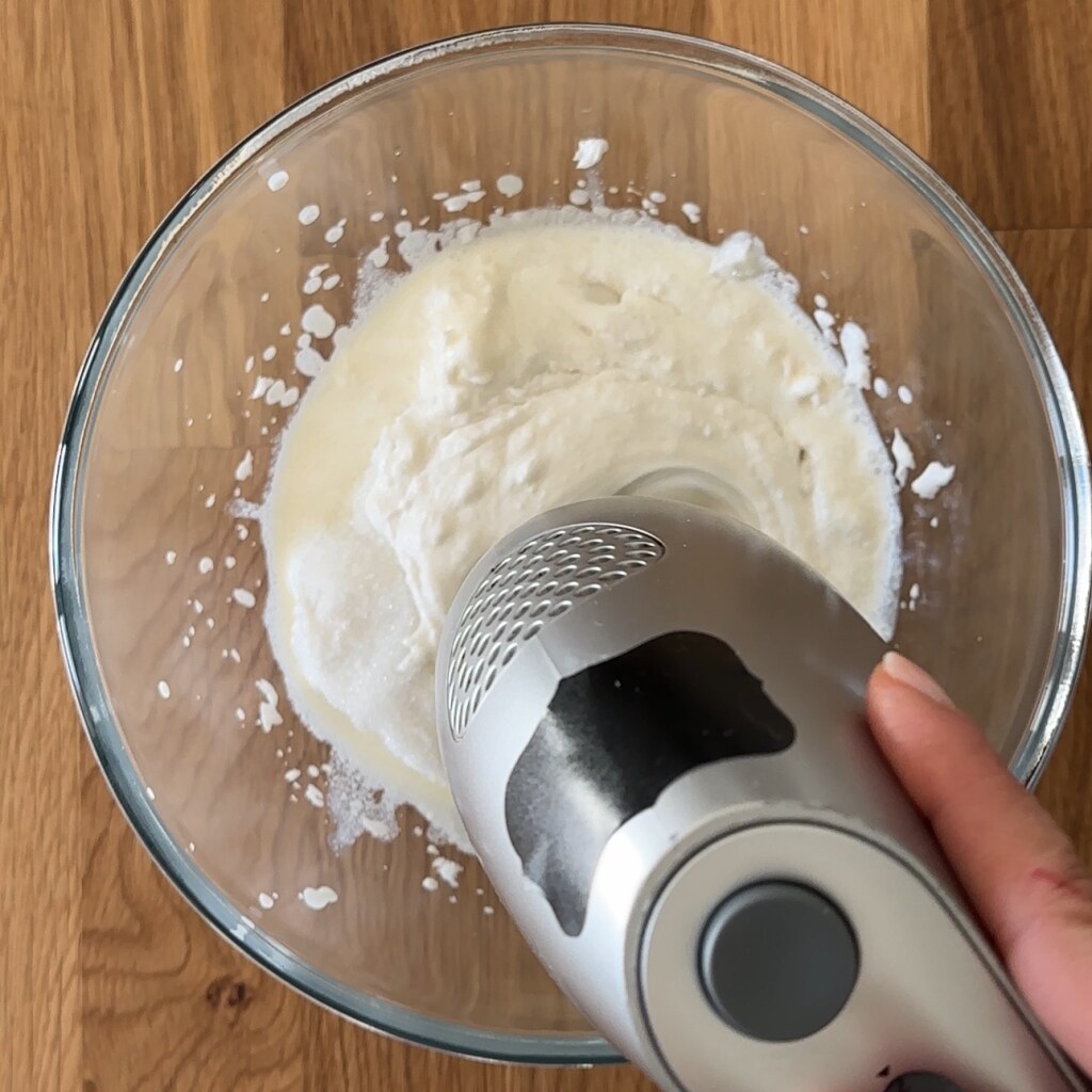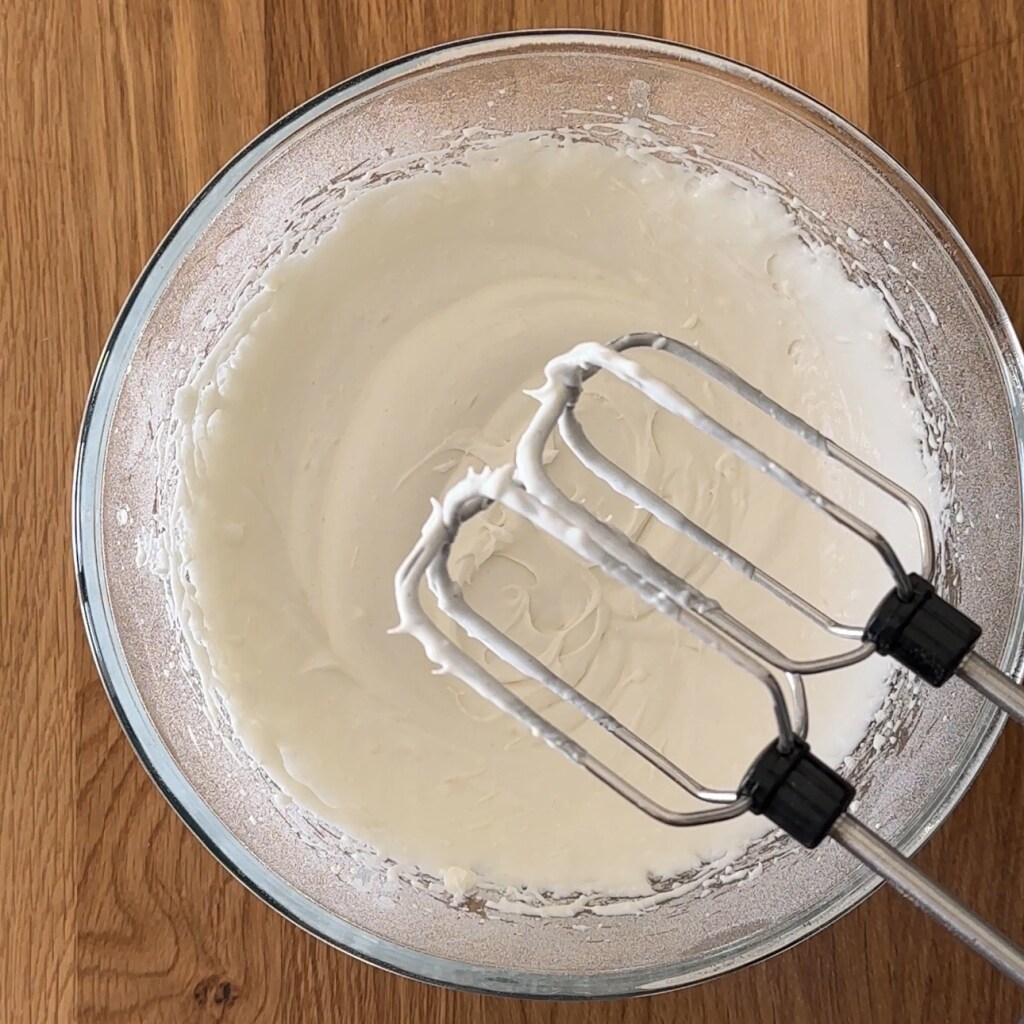 Klop met de kloppers, op maximale snelheid, totdat het mengsel dikker wordt en gaat opstijven.