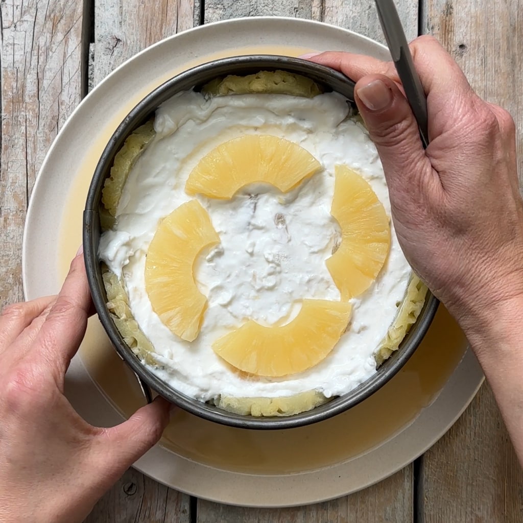Neem 6 plakjes ananas en laat ze tegen de rand van de vorm aanleunen, zoals op de foto.