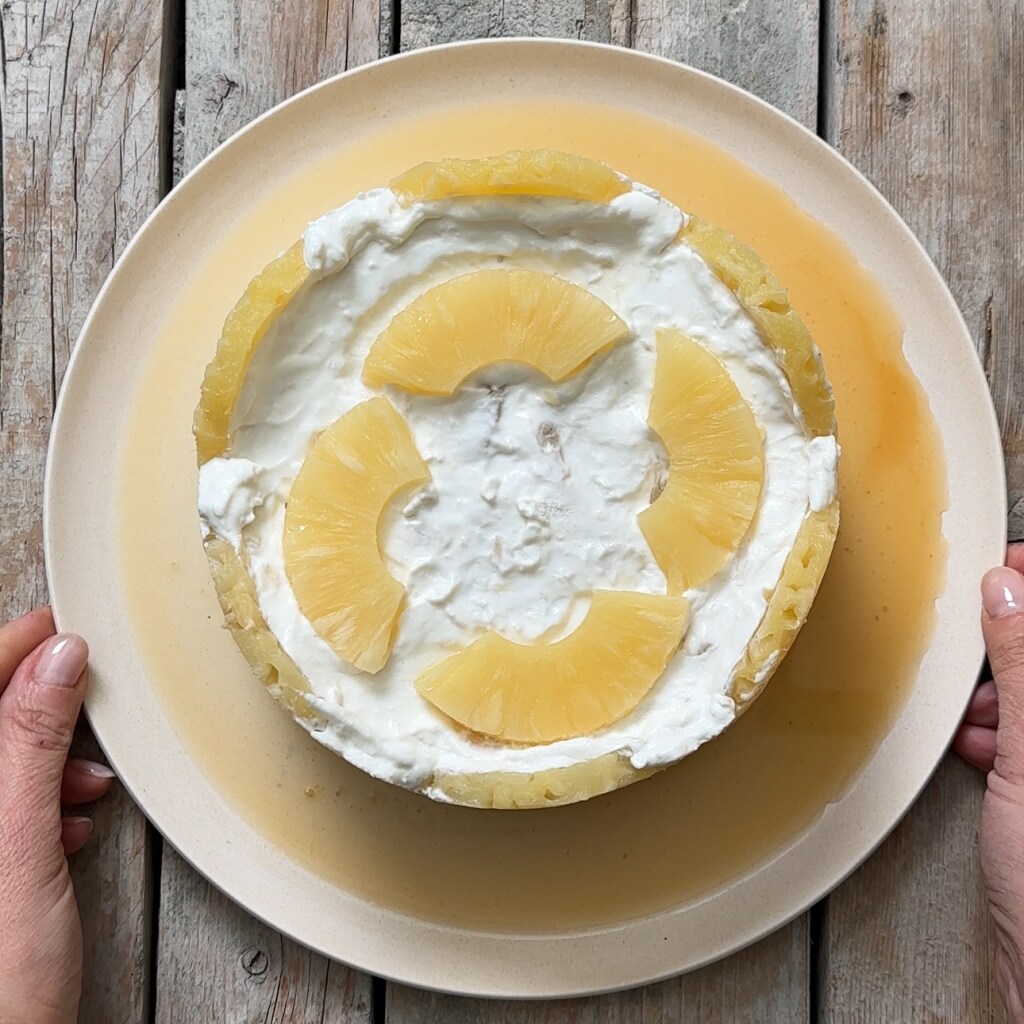 Breng 50 ml ananassap aan de kook, waarin je agar agar hebt opgelost, goed roeren. Voeg het mengsel toe aan de yoghurtcrème en meng goed. Snijd 2 plakjes ananas in blokjes en meng ze door de yoghurtcrème, altijd met opwaartse bewegingen.