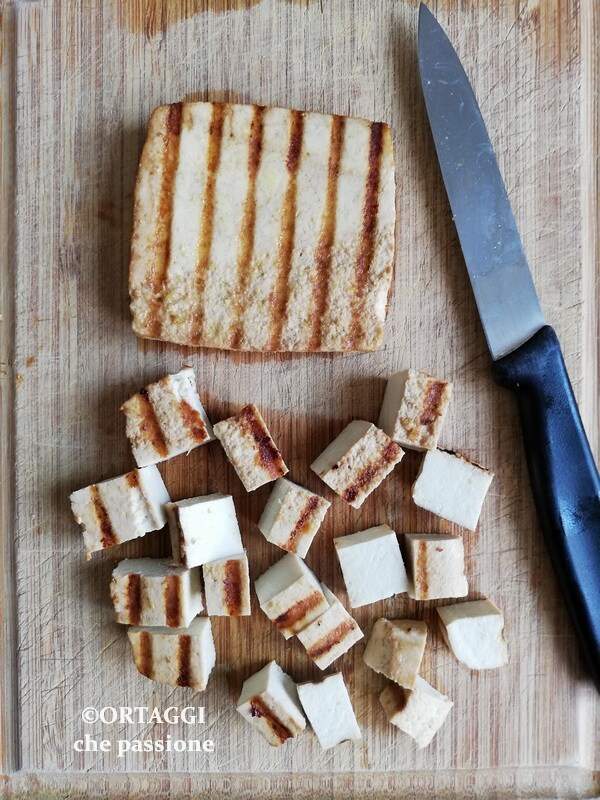 Gril de plakken tofu en snijd ze daarna in regelmatige blokjes.