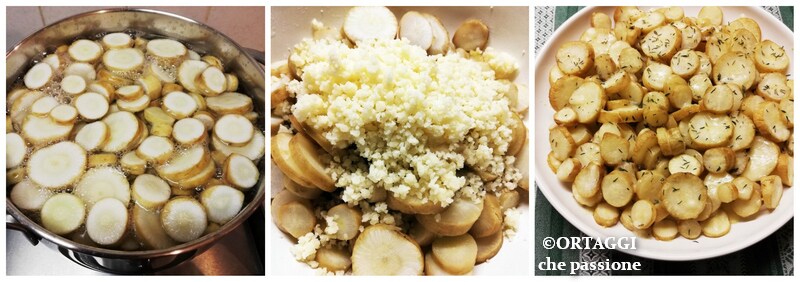 De gebakken bittere wortels zijn een eenvoudig recept, een gegratineerd en smaakvol bijgerecht dat de intense en bittere smaak van deze eetbare wortel benadrukt. De porties van dit vegetarische gerecht, zoals mijn man zegt, kunnen voor 4 of 6 personen zijn, afhankelijk van je moed om ze te eten. Zonder grappen, wij vinden deze witte wortels lekker. Een groente rijk aan voedingsstoffen en gezond, een echte medicijn voor zijn reinigende eigenschappen, ook geweldig voor het verwijderen van darmgassen zonder specifieke contra-indicaties, behalve sociale. Ontdek hier zijn voedingswaarden.