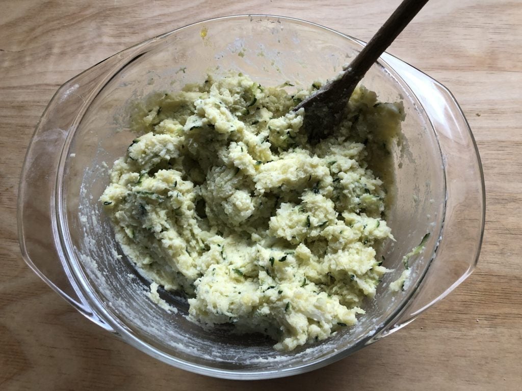 Doe de courgettes in de kom met de aardappelen en voeg ook de fijngehakte lente-ui en het ei toe.