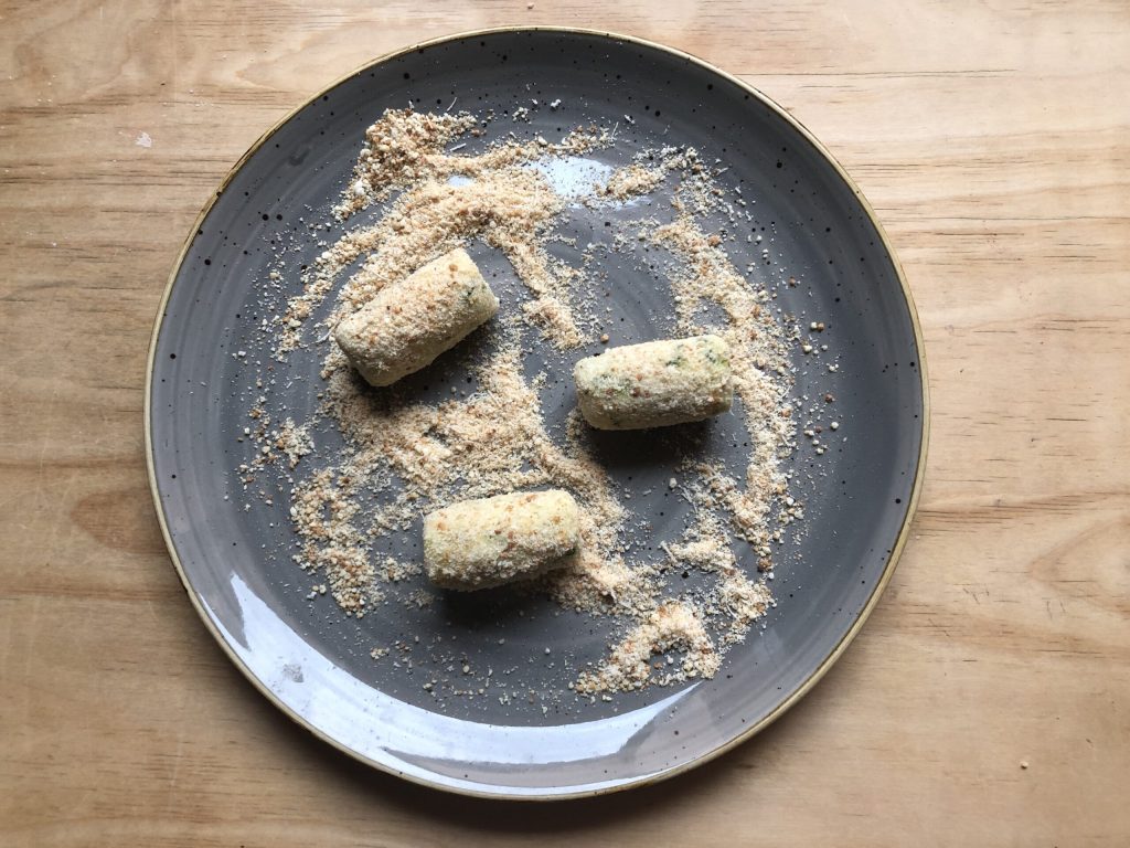 En nu de paneerlaag: giet een beetje paneermeel en een beetje geraspte kaas op een bord en meng ze door elkaar. Ik deed alles op het oog, steeds opnieuw paneermeel voorbereiden zodra het opraakte. Op deze manier heb ik onnodige verspilling vermeden. Rol vervolgens de kroketten erin zodat ze perfect bedekt zijn, ook aan de uiteinden.