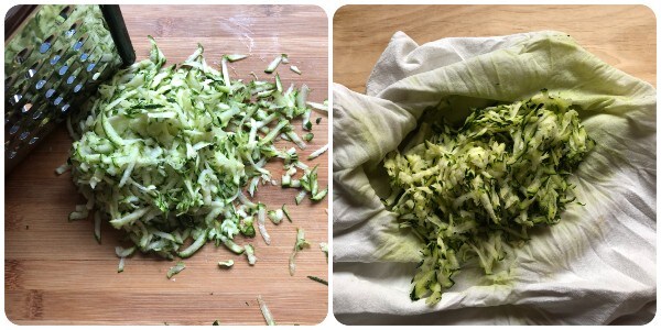 Snijd de uiteinden van de courgette, was hem, dep hem droog met keukenpapier en snijd hem in julienne reepjes met een rasp met grote gaten. Knijp hem daarna goed uit met een schone theedoek om overtollig vocht te verwijderen.