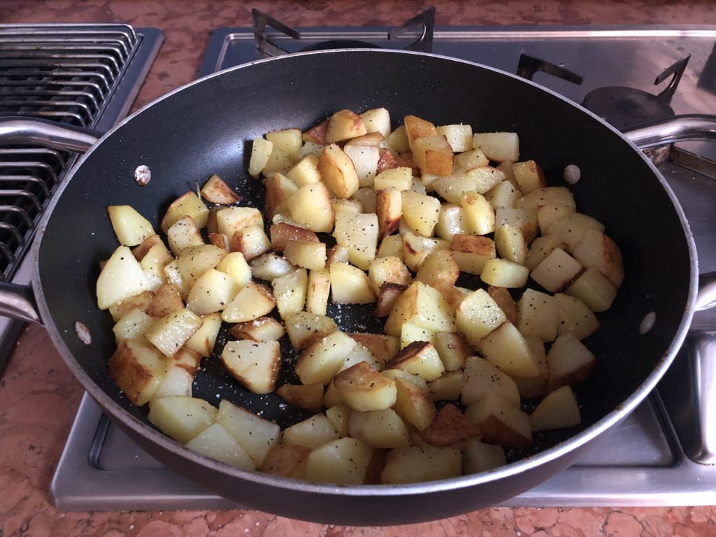 Bak ze op middelhoog vuur gedurende 10 minuten en roer ze vaak om (ze moeten goudbruin en knapperig worden), voeg dan zout en peper naar smaak toe, zet het vuur uit en verwijder de knoflookteen en de rozemarijntakjes.