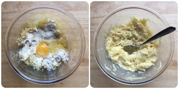 • Schil de aardappelen, was ze, droog ze af met keukenpapier en rasp ze (rauw) met een rasp met grote gaten. Verzamel ze vervolgens in een kom.