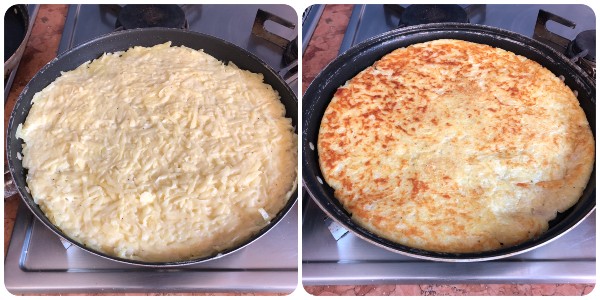 • Dek af, verlaag het vuur en kook tot de onderkant goudbruin is, draai dan de aardappeltaart om en laat ook de andere kant goudbruin worden.