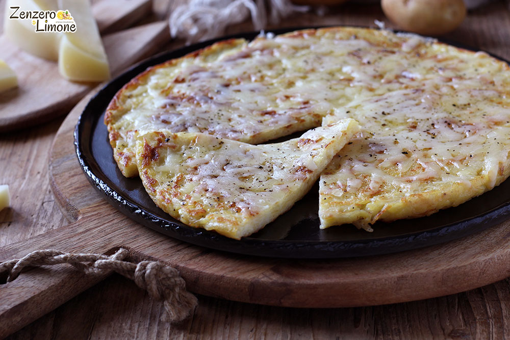 • Wanneer de aardappeltaart in de pan aan beide kanten gaar is, zet het vuur uit en verdeel de kaas over het oppervlak; voeg vervolgens wat versgemalen zwarte peper toe.
