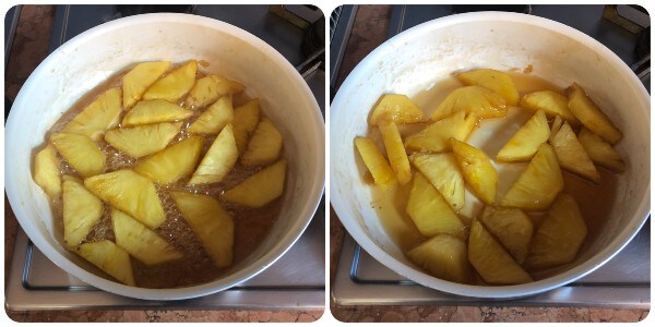 Wanneer de suiker volledig is opgelost, giet de amarettolikeur in de pan en voeg de ananasstukjes toe.