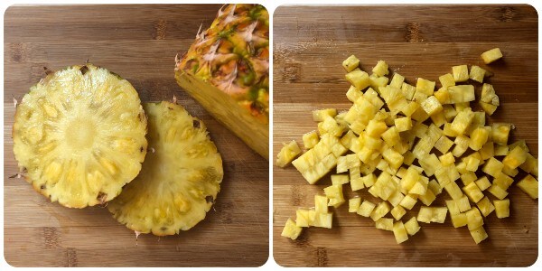 Snijd vier plakken ananas van ongeveer 1 cm dik. Verwijder de schil en het harde midden en snijd het vruchtvlees in blokjes.