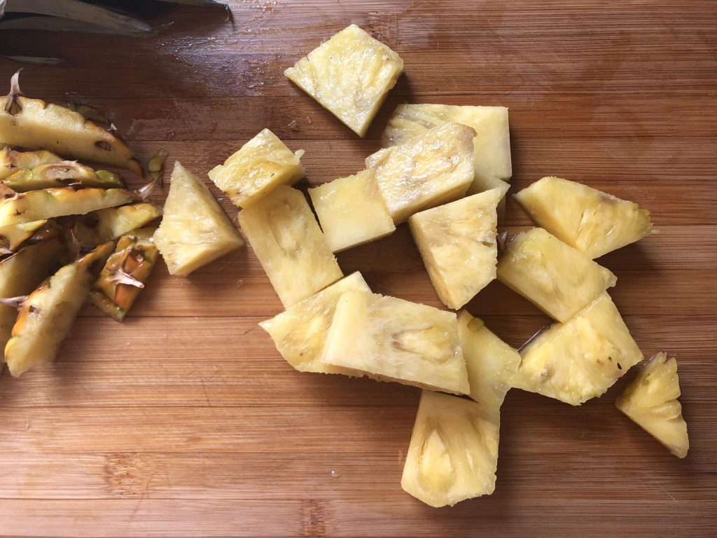 • Verwijder de schil van de ananasplakken en snijd ze in stukken. Het is niet nodig om het harde centrale deel te verwijderen.