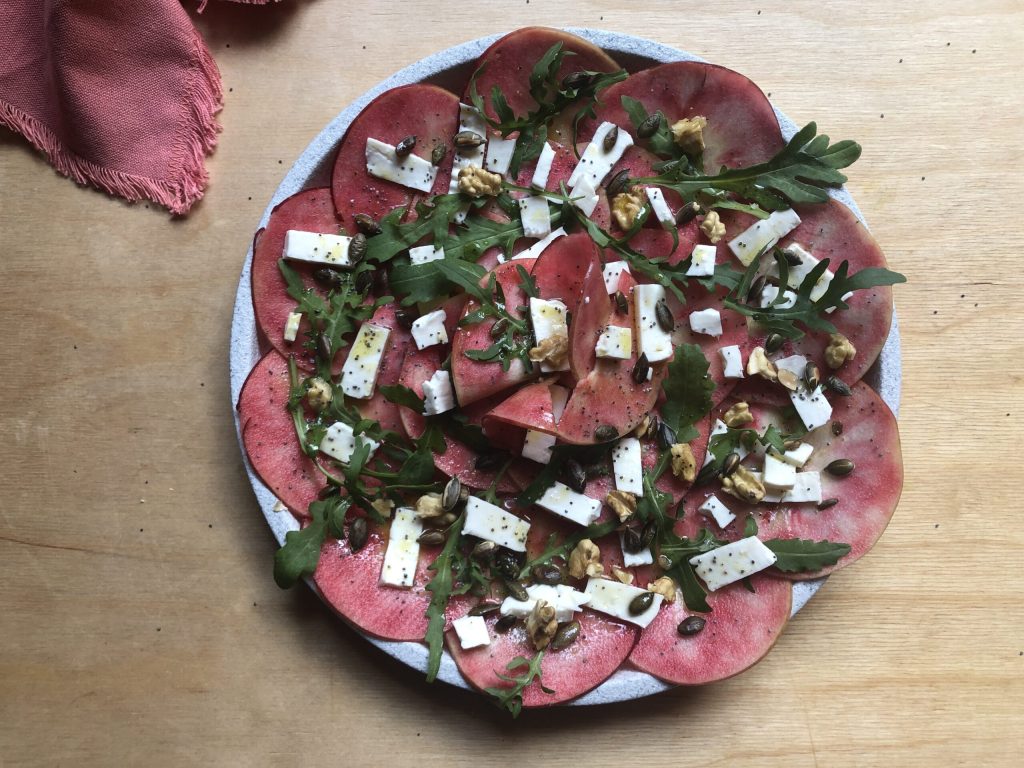 De Kissabel-appels hebben vruchtvlees dat varieert van roze tot diep rood. Ze zijn knapperig en hun smaak bevat tonen van bessen. Bovendien (hoor en wederhoor) worden ze NIET bruin na het snijden en zijn daarom ideaal voor dit recept. Als je ze niet kunt vinden (zucht!), kun je dit carpaccio bereiden met Fuji of Pink Lady-appels. In dat geval, om het kleurenspel te herstellen, raad ik aan om wat granaatappelpitjes toe te voegen, die naast een prachtig visueel contrast ook een aangename zure noot geven.