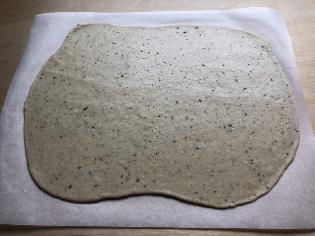Breng het over op een vel bakpapier. Voor deze handeling kun je de rechthoek om de deegroller wikkelen of, zoals ik deed, een vel bakpapier er bovenop leggen en de werkbank omdraaien. Uiteraard kan ik dit doen omdat ik een siliconen werkblad gebruik.