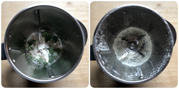 Doe de rozemarijnnaaldjes, twee blaadjes salie en een snufje peperoncino in de kom (hoeveelheid naar smaak). Voeg 30 g van de totale hoeveelheid meel toe en maal fijn: met de Bimby heb ik 20 seconden gewerkt, beginnend bij snelheid 6 en geleidelijk oplopend tot snelheid 9.