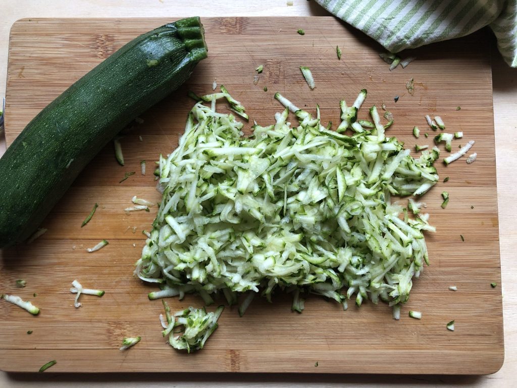 Was de courgettes, snijd de uiteinden eraf en rasp ze met een rasp met grote gaten. Zet ze apart.