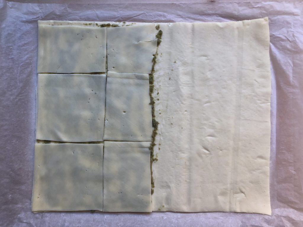 Rol het rechthoekige bladerdeeg uit en laat het op het bijgeleverde bakpapier liggen, smeer dan de helft met groene olijvenpasta (zwarte olijvenpasta is ook prima, dat is misschien gemakkelijker te vinden).
