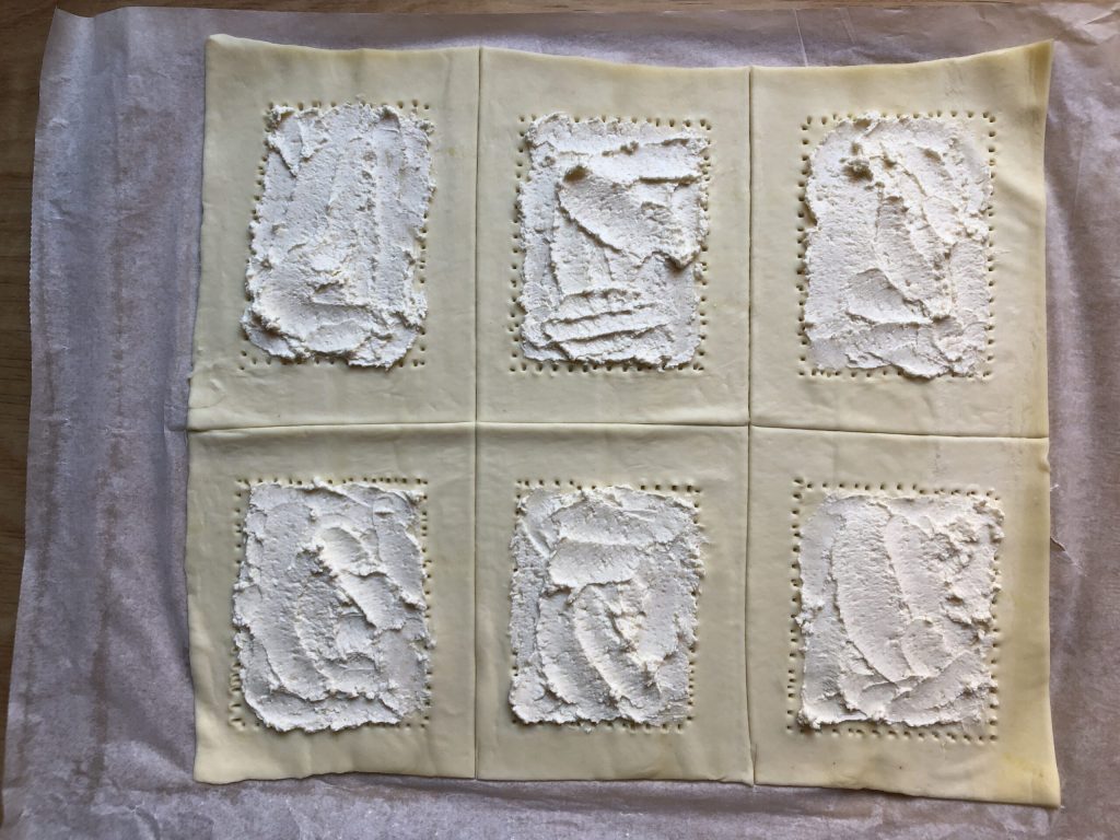 Rol het bladerdeeg uit, ga er voorzichtig met een deegroller overheen en verdeel het in 6 rechthoeken.