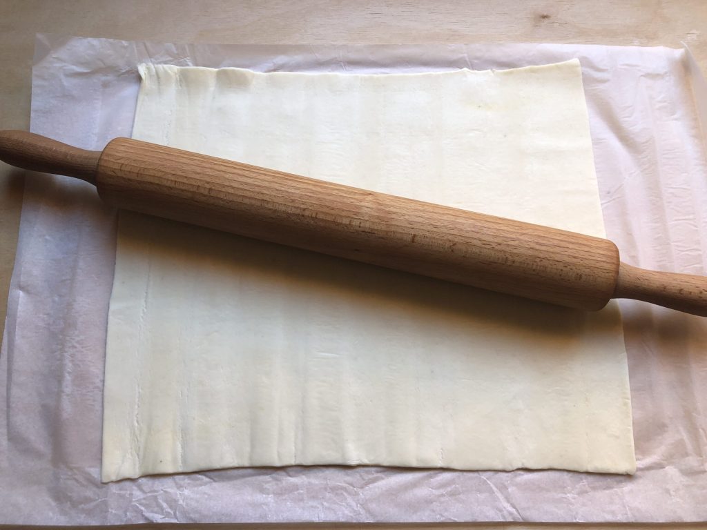 Rol het rechthoekige vel bladerdeeg uit terwijl het op het bakpapier uit de verpakking blijft liggen. Rol er vervolgens voorzichtig met de deegroller overheen zodat het gelijkmatig wordt uitgerold.