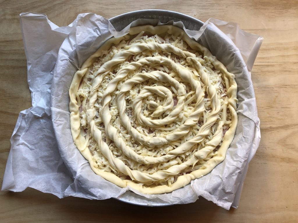 Maak op dezelfde manier andere twists en plaats ze geleidelijk in de bakvorm, te beginnen van het midden en verder naar de rand.