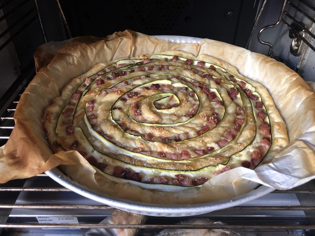 Plaats vervolgens de halve courgetteplakken rechtop (met de gekleurde kant naar boven) tegen de twists van bladerdeeg.