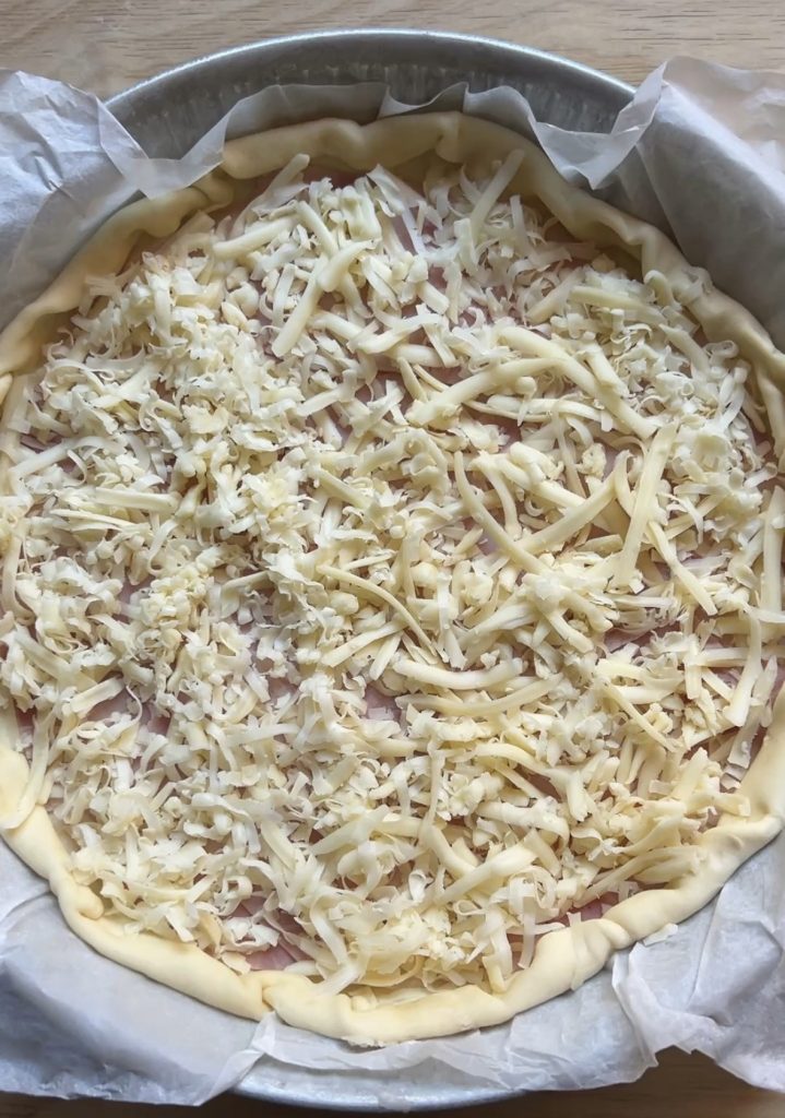 Vul ten slotte de open ruimtes van de bladerdeegrol met de blokjes gekookte ham en strooi er de geraspte kaas over.