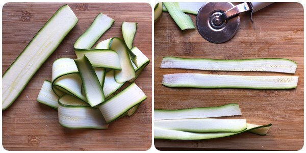 Snijd de uiteinden van de courgette, was hem, dep hem droog met keukenpapier en snijd hem in dunne plakjes met een mandoline. Snijd vervolgens elke plak over de lengte doormidden.