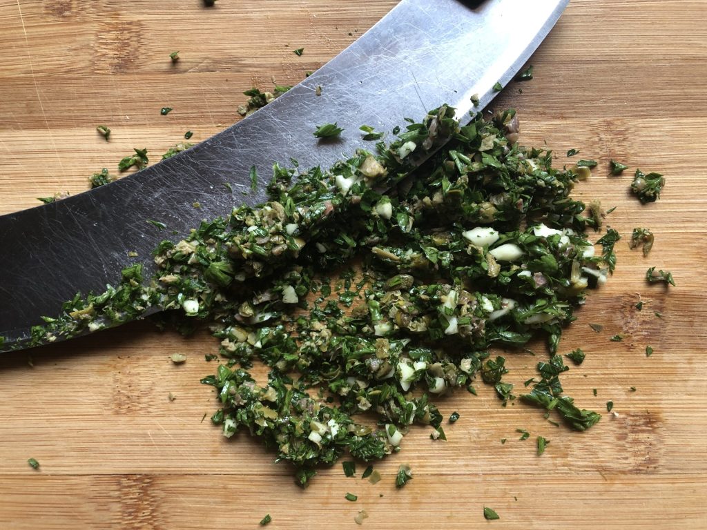 Hak met een mezzaluna grof de ansjovisfilets samen met de knoflook (geschild en zonder de centrale kern), de kappertjes en de peterselie.