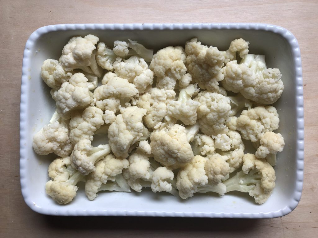 Bestrijk de bodem en de randen van een ovenschaal licht met olie en leg de bloemkoolroosjes erin (ik raad aan om de grotere doormidden te snijden).