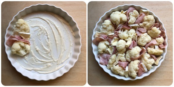 Doe de bloemkoolroosjes afwisselend met plakjes gekookte ham en stukjes brie in de schaal (ik heb de korst er niet af gehaald). Zout en peper naar smaak.