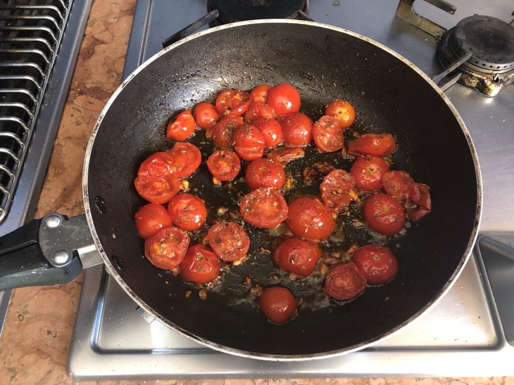 Bak ze kort op hoog vuur, breng ze dan op smaak met een snufje zout en een snufje bruine suiker en kook ze nog een paar minuten op een lager vuur, af en toe roerend. Je cherrytomaten zijn klaar als ze zacht zijn. De tijd kan variëren afhankelijk van hun grootte. Zet tenslotte het vuur uit en breng op smaak met veel oregano.