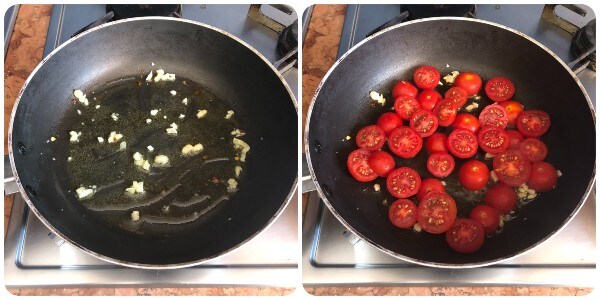 Verhit een scheutje olie in een kleine koekenpan en bak hierin een fijngesneden halve teen knoflook (of heel, als je het niet lekker vindt) en een snufje peper voordat je de cherrytomaten toevoegt.