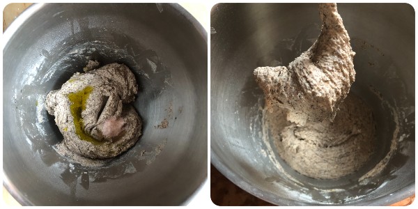 Voeg vervolgens geleidelijk het lauwe water toe, werkend met de deeghaak op middellaag toerental. Mogelijk is niet al het water nodig: bij mij bleef er bijvoorbeeld 20 ml over.