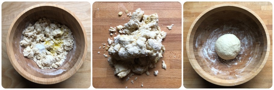 Voeg tenslotte het zout en de olie toe. Breng het mengsel over op het werkblad en kneed het krachtig tot je een glad en homogeen deeg hebt. Vorm een bal. Leg deze in een kom, dek af en laat deze een half uur op kamertemperatuur rusten.