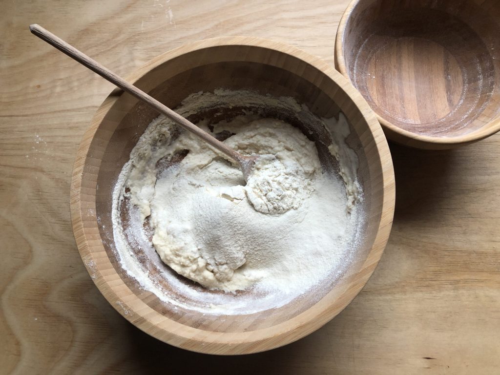 Voeg op dit punt de resterende bloem toe en meng opnieuw met de lepel.