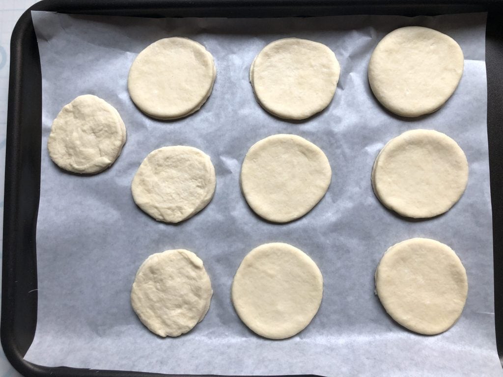 Na de rusttijd het deeg uitrollen met de deegroller tot een dikte van ongeveer een halve centimeter en cirkels uitsnijden met een diameter van 8 cm (ik heb een deegsnijder gebruikt, maar een glas of een kommetje is ook prima en je kunt de broodjes ook groter maken, als je dat wilt).