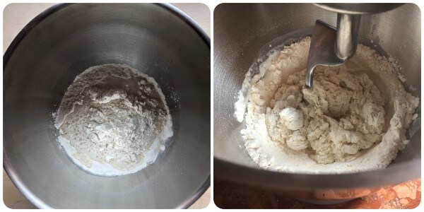 Doe de twee soorten meel in de kom van de keukenmachine, voeg de droge gist toe en meng met een kleine handgarde.