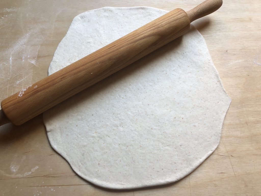 Na deze eerste rijs rol je het deeg met de deegroller uit tot een dikte van ongeveer 4 mm.