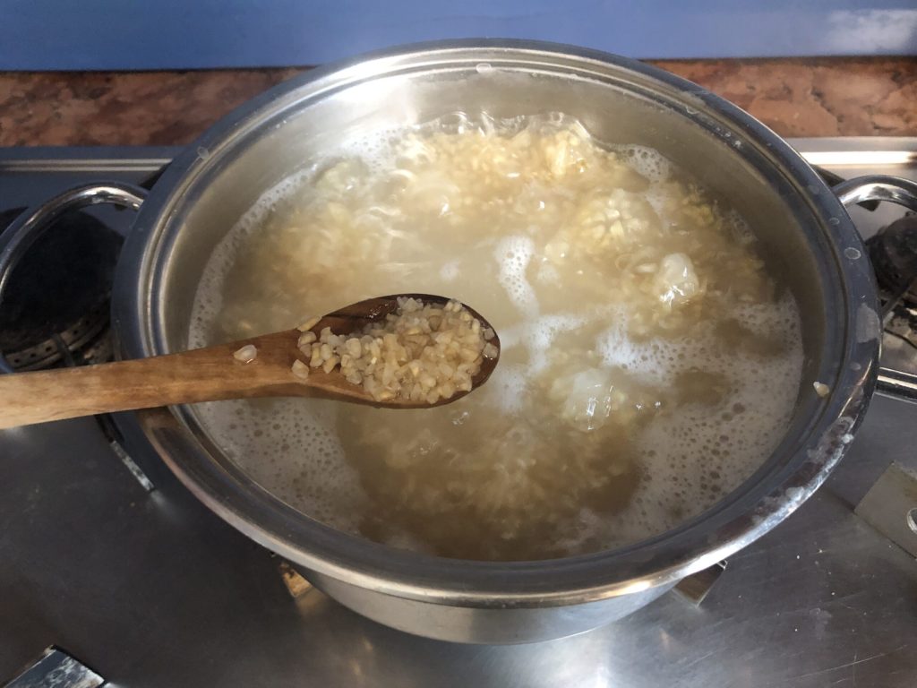 Wanneer de bulgur gaar is, giet deze af zonder te veel te laten uitlekken en doe het direct in de braadpan met de gesauteerde sjalot.