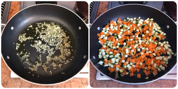 Snijd de uiteinden van de courgettes en schraap de wortelen. Was ze vervolgens, dep ze af met keukenpapier en snijd ze in blokjes. Om dit eenvoudig te doen, snijd ze eerst in luciferstokjes: ik laat HIER zien hoe.
