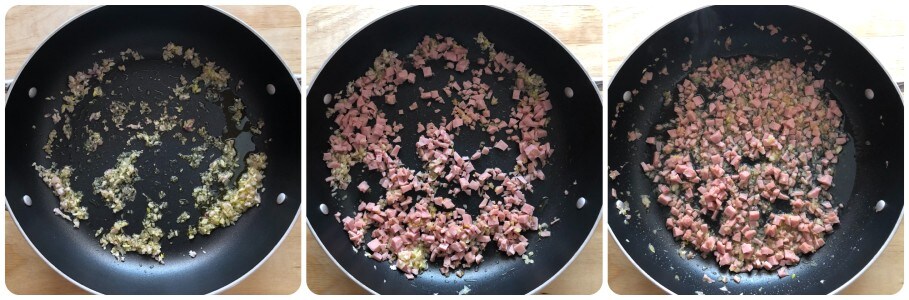 Verhit in een grote koekenpan enkele eetlepels olie en voeg daar de knoflook en de sjalot aan toe. Als het mengsel begint te sissen, voeg de gekookte ham toe.
