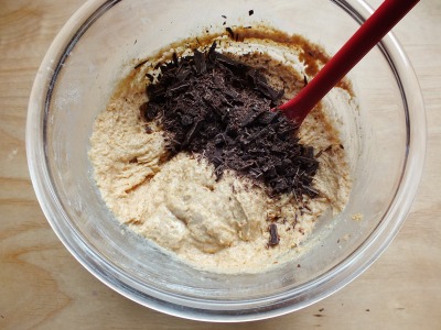 Voeg ten slotte 3/4 van de gehakte chocolade toe aan het mengsel en meng opnieuw. Ik bewaar meestal de grotere stukken voor de topping.
