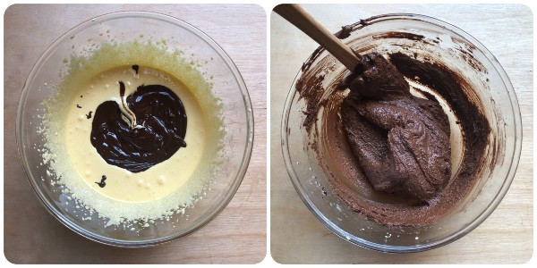 • Voeg de inmiddels lauwe gesmolten chocolade toe en roer goed door totdat deze volledig met het mengsel is opgenomen.