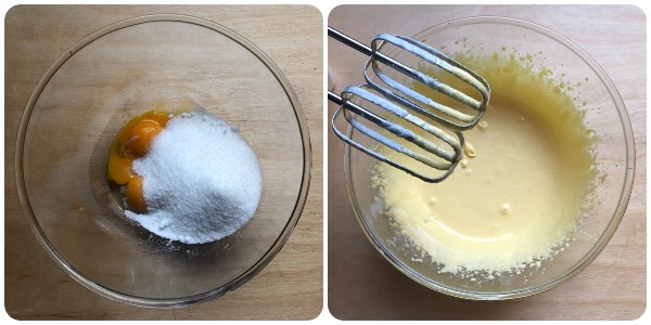 • Voeg de suiker bij de eidooiers en klop ze zeer goed op, opnieuw met de elektrische garde, tot je een licht en egaal mengsel krijgt.