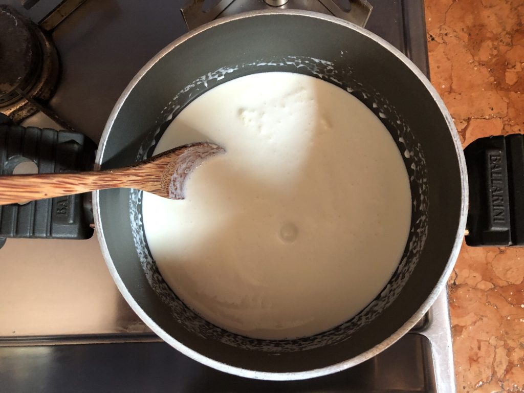 • Zet de pan op het vuur op een zeer zacht vuur en breng het bijna aan de kook, regelmatig roerend.