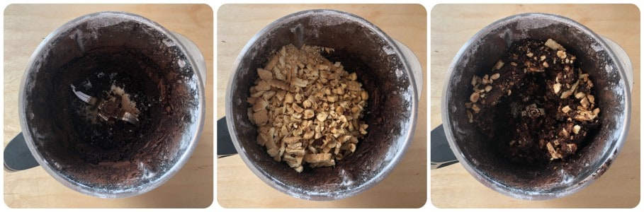 Voeg op dit punt de melk, de likeur, de koekjes en de hazelnoten toe en kneed (15 sec. snelheid 3, tegen de klok in). Als je het voor kinderen maakt, kun je de Marsala weglaten.