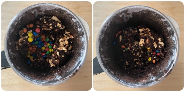 Voeg tot slot ook 100 g chocoladelinzen toe en meng ze door het deeg (15 sec. snelheid 2, tegen de klok in)