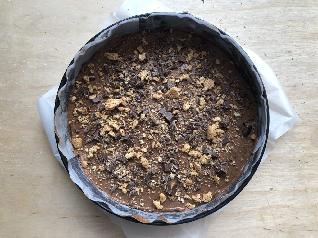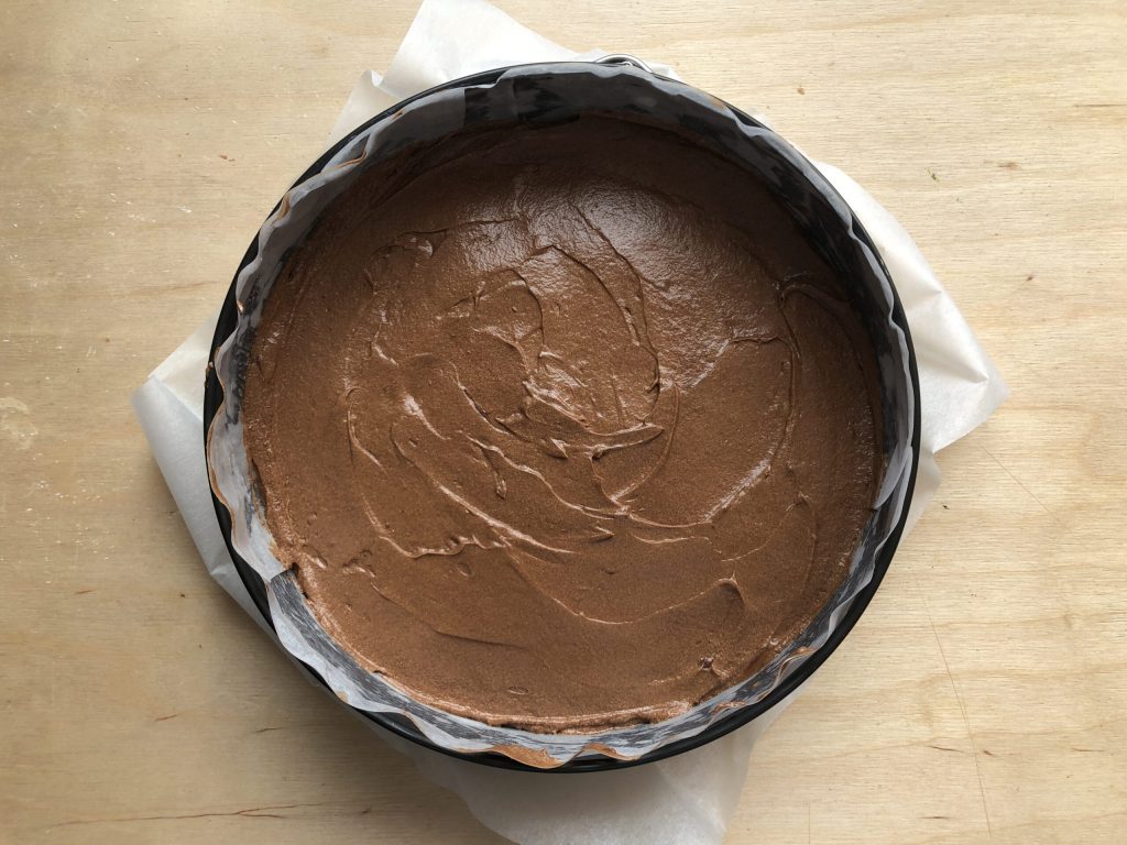 Giet het zachte en homogene mengsel in een springvorm met een diameter van 22 cm, die je eerder bekleedde met bakpapier en strijk het glad.